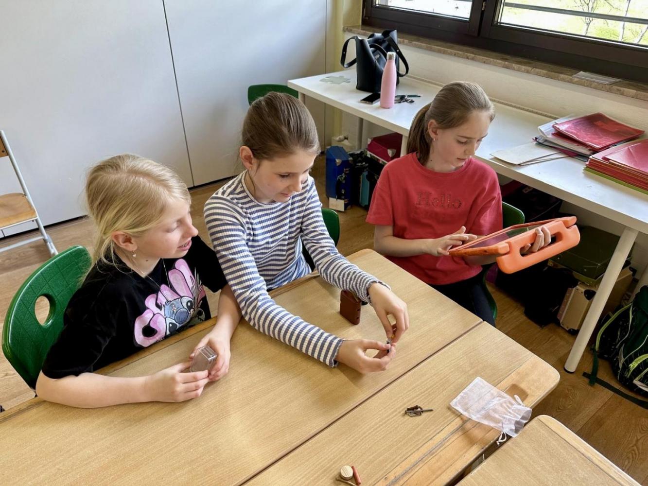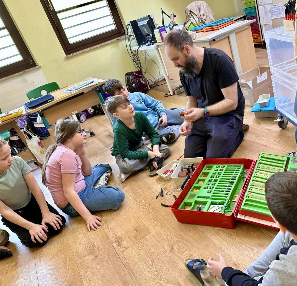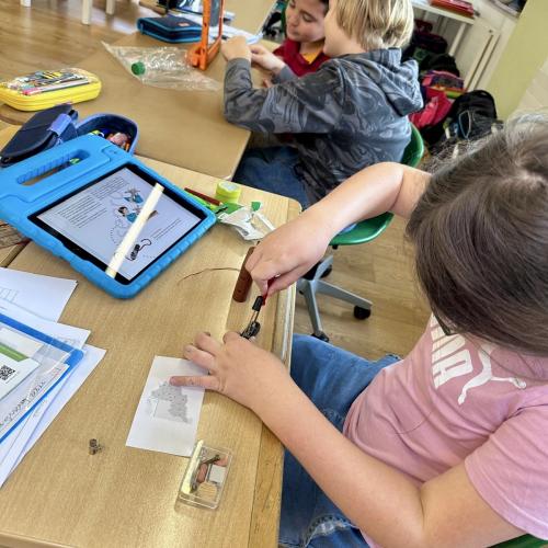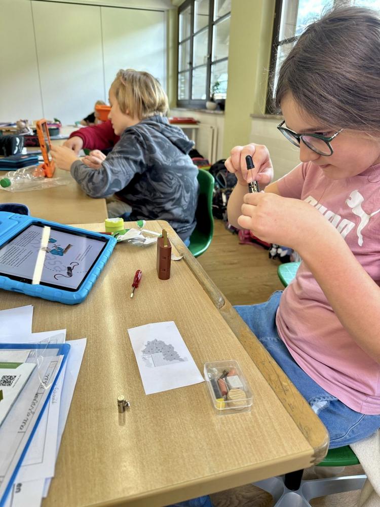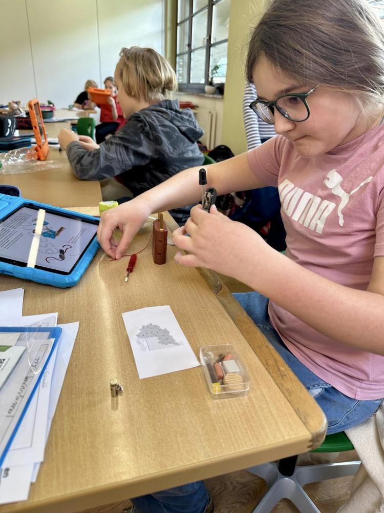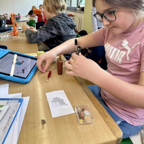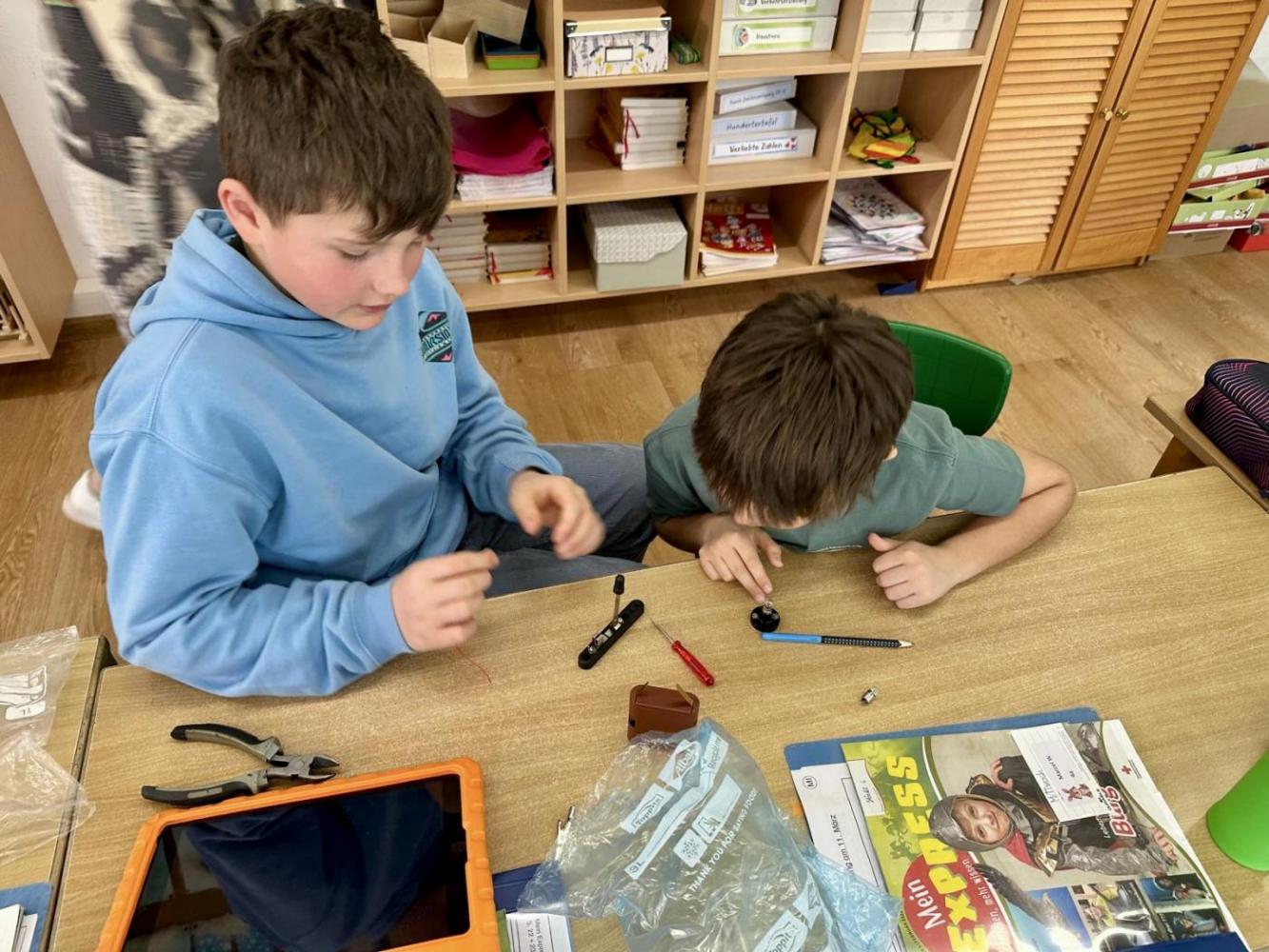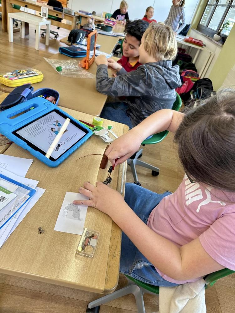 Mit dem Stromkreis‑Experimentierset haben die Kinder ausprobiert, welche Materialien Strom leiten können. Sie bauten einfache Stromkreise mit Reihen‑ und Parallelschaltungen. Danach durfte jedes Kind eine eigene Laufbürste mit dem Namen „Wirbelwind“ basteln. Zum Schluss wurden die Bürsten im Pausenhof getestet. Dabei entstand ein tolles gemeinsames Gruppenbild.